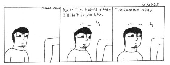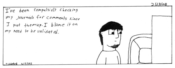 This is the flipside of wanting to be honest in both my comic journal and webjournal. I worry that someone will call me up and bitch at me. Comic 3 Who doesn't want a little attention and validation from time to time? With this comicjournal(and webjournal to a certain extent) I always strive for honesty. I try to ignore the voice that says "You'll regret saying that" or "It'll come back and bite you in the ass". So I intead to just go with it a pray. Thats all for today, enjoy.