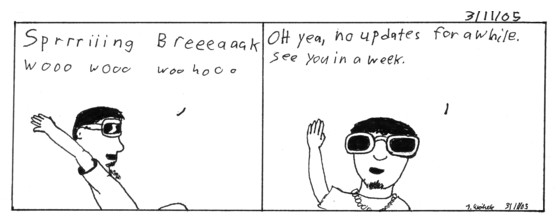 And that'll be the only new one for awhile. As the strip explains today is the begining of my spring break. Since I've taken a week off from work I decided I will also take a week off from the strip. That doesn't mean I won't be drawing during the break, I just won't post them or they might just be rough sketches. Don't be afraid me children I will post next week. Take it easy, SPRING BREAK 05 WOooooooo. So while I will be drawing strips I won't be posting them cause my computer will remain in school while I vaction in philly.