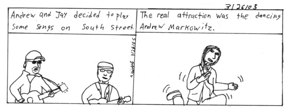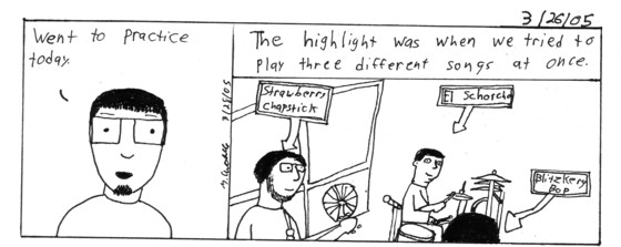 Comic 1 I go to band practice every saturday, since nothing interesting happens I usually don't right about it, but every once in awhile.Comic 2 Eventually we set up shop next to the Dairy Queen. I would try to get people to sign the band's mailing list, Tiff(looking like a homeless person)held the ign for the band, Andrew M. danced and a friend named Jeff stood and ate ice cream. At one point there was a nice size crowd, unfortuantly Jay and Andrew couldn't stop arguing, but they got a lot a people to sign their mailing list. Comic 3 It kinda still works, except for the up arrow and the 2 and 5 button. Was annoying because I can't really text anybody cause I'm missing a,b,c,(looks at phone)j,k,l.