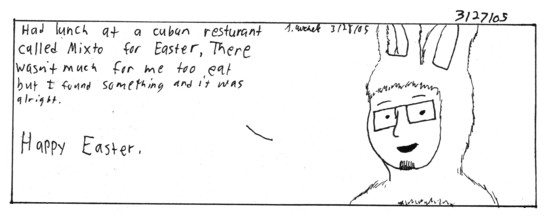 Since my roommate decided to sleep at a somewhat resonable hour I got the comics up late. Anyway enjoy. Also beware of new strips in the future from Under Construction and a as of yet untitled (CBA SONG, hmm now that I think about it may be the new title.) comic strip joining the Stars on the Ceiling mix. It be a speacial installment that would only appear on cetain days, or at least I hope so. Well go back to enjoying, later. I always try to draw holiday appropriate outfits whenever I can. I ordered chicken and rice, it was more rice and sausage then chicken, but I was full thanks to bread and soda. For desert I got a soogy with milk pound cake. I got mad cause I saw for dinner they have barabcued chicken. I also find it funny whenever I go out to eat with my family they always talk about how I eat as if I'm not even there.