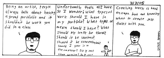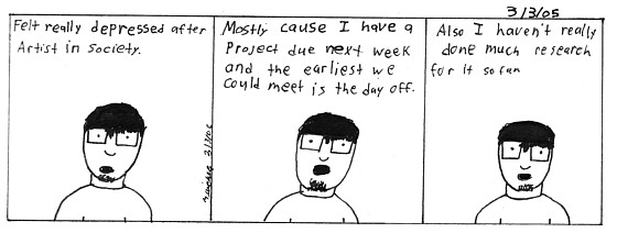 Warning these are kinda downer ones. I feel this is the forum for my life. The good and the bad. It would be a lie to just do funny comics about my life (even though there is hilarity all around me). I guess I just take this comic serious when I convey my life. Writing that just made me feel like a selfimportant artist who takes himself too seriously. Shit. Comic 1 This is just compounded by the confusion of what field I want to enter in the arts. Also my lack of knowledge of what I call my major. Comic 2 All I can say is, shit.