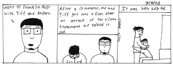 For the past two weeks I just felt like we are pissed at each other. I found out I was right. We had a chat in the mall while Andrew wondered away from us to give us time alone. It might not be fully resolved but it's close. That is all for now, later.
