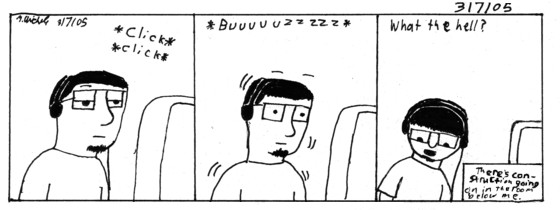 Comic 1 The constructions been going on since the fire, but this is the first time I actually felt it. I thought (what I'm guessing it was) the drill was gonna come through the floor under my chair.Comics 2 Oh what fun these are. A friend of mine gave up coke to stop from getting more cavities. I don't think I can make the same sacrafice.