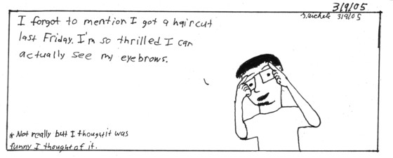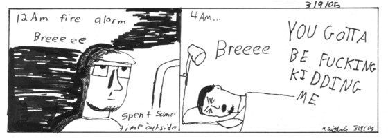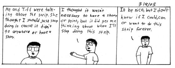 More tales of me Comic 1 It was just a brief funny thought I thought I'd write about. Comic 2 I say this because only a select few read this strip, so if I have such a small audience I'm really only doing this for myself. In in itself that isn't so bad. I really do this for myself anyway. I imagine it'll come down to who cares if I stop. Comic 3 I really like how I inked this comic. I rarly add artistic elements to my comics but I like to try every once in a while.
