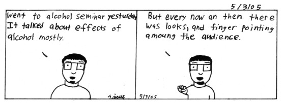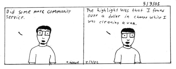 Me and my roommates were suppose to do a bar-b-que, but it was cancled. So we worked at the gym. I actually utilized my drawing skills and made some signs(I just did so letters really). Then we cleaned out some vans, thats where I found the change(which will help me get to philly tomorrow).Then we sprayed wd-40 on anything metal in the gym to clean it. We ended our service by cutting velcrow. Fun times only 15 more hours left. Comic 2