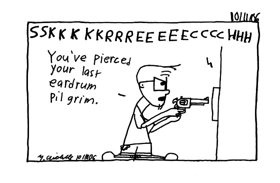 Yea every once in awhile the library's somewhat tranquil air is shattered by some sort off loud noise (not coming from me). The most annoying is the screech I portray in the comic. Cause we can't turn it off and the high pitchness gets under my skin. BAH!!!