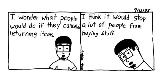 I believe in what I said above, and I couldn't find a punch line haha. Seriously though, people have refused to buy something because they can't return it(as well as other equally ridiculous reasons). I'm not saying ban accountability on shoddy products. Just cutting out the middle man and go right to the person who made it. Also it simplifies the return policy by having none haha. I think it just used to make people feel better about buying something, cause it can fall apart in the first week but at least I can return it.