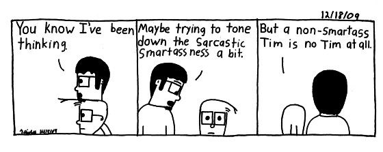 I really am. I don't know I've just been a smartass for so long people would find it strange (as would I) that I wouldn't contradict people or answer question with a smartass remark. I guess I'm beginning to think I might repel people by being a smart ass. Also the verbal sparing with someone trying to counteract my sarcasm is getting tiring.