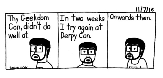 The story of Thy Geekdom Con was simple. Sat at my table, sold a little, then went home. Not riveting storytelling but hey it's what happened.