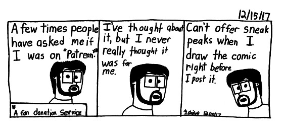 The way I feel about it is that people are just giving you money. Granted there are probably perks or behind the scenes things and it is supporting the artist. But I'm more old fashioned in the sense that you give me money I give you something in return. Like when I go to shows to sell stuff. I think the biggest thing stopping me is what to offer in the way of incentives. Maybe an exclusive comic or offers of sketches. So I ask you loyal readers. If I did start up a patreon what kinda things could I offer to entice you to support me? Leave comments on your respective outlet.