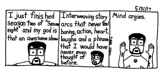 For those who are wondering what I'm talking about, Sense8 is a show on Netflix about 8 people who are telepathically linked. It has a diverse cast that have individual lives but mesh well together. It's a great show and in it's two season is pulling back to a larger world and I'm excited to find out. Though I am annoyed season 2 ended on a cliffhanger even without it I can't wait for season 3. A unique thing about this show besides it's diverse cast is that even though it's a sci-fi show, there are hardly any special effects in it. There is a lot of globe trotting(which I imagine justifies it's 9 million an episode price tag) but there is no real sci fi type things. At the heart of the show is the ensemble cast and the bond that grows within them and the few regular characters. Also the struggles the characters go through but eventually overcome(you know tv and all). Though it is a touching show, when there is action it's pretty awesome. As for the mind orgies comment. In the first season when single characters had sex the rest of the cluster(term for the group of connected people) seem to join in with their minds. In the second season they kinda don't do such things.