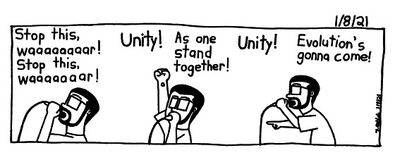 "Civilization, ha, I call it as I see it. I call this bullshit you know, I still cannot believe it. Our evolution now has gone the way of hate. A world evolved, resolved in this stupid fate." (Unity, Operation Ivy)