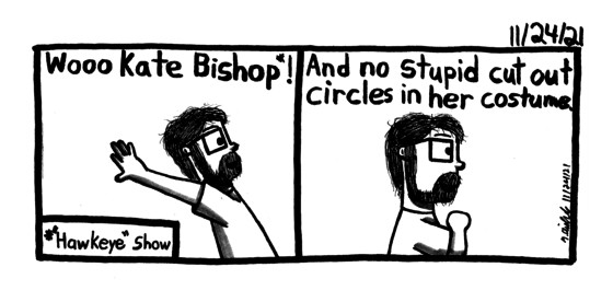 I watched the new Hawkeye show. I like it so far. It's an adaptation of my favorite series of Hawkeye comics. The only bad thing in the comics is that Bishop's costume has holes in her costume on the hips (Also on her shoulders but I don't care about that). No offense to the designer, but I find it stupid to have them there. What possible function could it serve? My secret theory is they want to hint that she isn't wearing underwear or something. Regardless, I can't wait till the next episode.