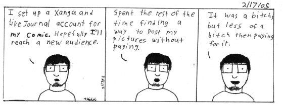 Also some grand news. I've caved in and got a webjournal. "Why some would ask" "You suck" others would say. Well it's mostly a hope to get more people reading my little strip. So click xanga and click live journal to go there. Maybe you'll learn something about me. So far the work has been a pain in the ass. A procedure that took like 10 minutes now takes like 20. Hopefully it'll all be worth it. Also another reason I have been apprehensive about doing a journal accompanied with my comic, because the comic is ment to be a journal. In turn I'll just be repeating myself. Also to avoid an ugly encounter with people I'm just going to speak in reference to the comic and not do a personal rambling. Cause in the end that's why webjournals cause so much trouble. Enough ranting. Enjoy.