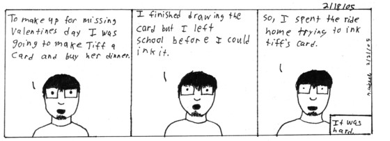 Comic 1 She loved the card, unfortuantly I spelled something wrong (apparently there is a "U" in "thousand"), but she thought it was cute. We ate at outback with my friend Andrew. Looking back I shoulda tried to make it just me and Tiff, because it was our valentines day makeup. Well unfortuanlty the night ended pretty badly. Not going into details, but just rest assured everything is okay.Comic 2 Now I don't drink that often but for some reason I just wanted a stiff drink. I only had two small drinks and lots of water. I just hung around with my roommates, which I rarely do. I didn't get to bed till 3:30. Which sucks because I have a 9 o'clock class.