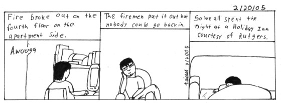 Comic 1 After all that happened I just wanted a cigarette.Comic 2 I JUST GOT BACK, I wasn't in the room twenty minutes before I was rushed out in my sweatpants. I sat in the campus center for about 2 hours before we got the hotel. I stayed with my roommate. He got the bed I took the fold out couch. Luckly the sprinkles didn't go off in my room, and nobody was hurt.
