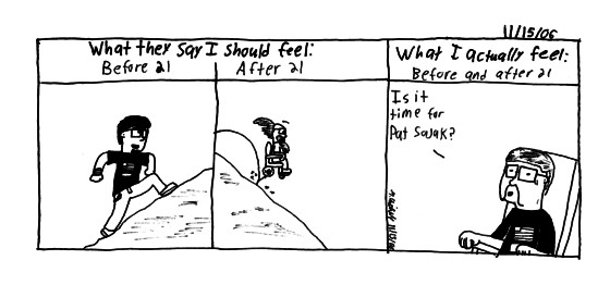 Yea a lot of people keep saying since I'm 22 I'm now old. Well besides the fact people are calling me old I really don't see it that way. I've always felt old. Groaning getting up, my knees crack, and I moan when I lay down. So I'm pretty much old already. haha What a great birthday. Thanks to all who made it possible. I started of my birthday by going into work early. Then at 12 I ran over to the animation lab to gather the gang to head to the Pearl. We had some food and drink. Awesome Jess payed for me and I have thanked her a lot. We left and we went our seprate ways. After class I went home, did my comic thing. Around 8 I went to Chickie and Petes to hang with South Philly friends. Fun times were had. I then picked up Darcy and raced back to Chickie and Petes to say goodbye to everybody. After that me and Darcy hung out for a bit. Ending the day where it usually starts, in bed. That's basically it. I've thanked everyone in a group and seperatly. So I say one last time. THANKS!!! "So you're tired of living and you feel like you might give in? Well don't. It's not your time."