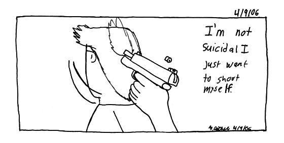 Yea, see I'm torn. Cause today I found out my Uncle Eddie, who lives in California, calls my grandparents every time he reads I'm depressed in this comic (also I'm totally clueless about my Uncle's favorite comic of mine). So I'm torn by being completely honest and the people who'll take this the wrong way. When I say "wrong way" is that I'm threatening to kill myself. Granted I'm sure I could think of a few moderately valid reason why. But I never would ever do such a selfish and foolish thing. There are most of you who know that and I guess I'm happy about that. Truthfully I feel dumb even explaining this to you guys, cause you know me better then that, I'm not that much of an attention whore to actually do this to show off how depressed I am. It's just honesty, hopefully this won't put any off you guys off. I do love life don't get me wrong, just sometimes death seems so much easier. I mean, don't you guys feel that way sometimes?
