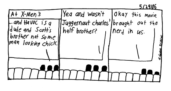 Boring days, no work, woooo. Went to go see X-men 3 with my sis kel and my best friend Andrew yesterday. I liked it. Beast was the best, he fucking went off on everybody and kicked ass. Waiting for the little thing at the end we started talking about how different it was from the comic book. It was really funny.