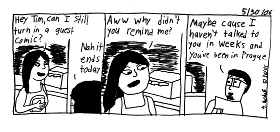 I think this is the perfect way to end a guest comic week. Not a thank you, but a fuck off. Thanks so much to Jon for providing a good sentament to the end. Also bravo for using photoshop to make this comic. Jon is a graphic designer I met at school and drink with frequently, ha. He doesn't have a website, so yea.
