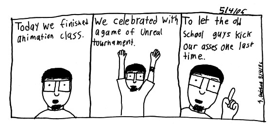 The total I believe is 22 to games to none. I feel ashamed. We have not won one game of capture the flag. Sadness and such. In today's game of unreal, one guy beat two off us and one other visitor. That just makes the fact he beat us sadder. But hey they've been playing it a lot longer. I do plan to play over the summer. Also technically it's not the last time we'll play against the old school, but a good portion, cause they're graduating. Which is good, cause we get to take over next year. Getting tired of being called a noob. Fucking elitist bastards. But I wish them all good luck. They're cool guys.