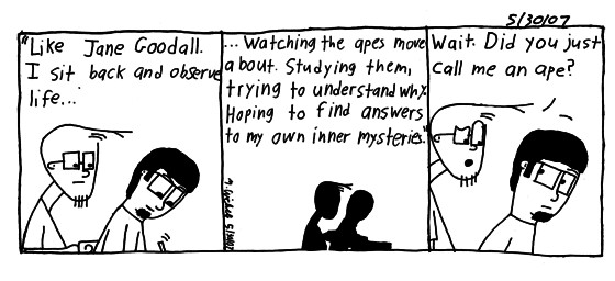 What sparked this was I was thinking of book called something along the lines of the hipsters bible. It was a book saying what's what in the indie scene and that it seem to be the be all and end all of it. It lead me too the thought of not just telling people how it should be, but how it is by observing hipster, and other scenes and writing about what they observe (don't get me wrong, I'm sure they researched it and the build the rules from that). Then I thought of Jane Goodall, famous for her observations of monkeys. Which lead me too the final thought of observing people to figure out things about yourself. Much like case studies are suppose to apply to everyone else that are similar.