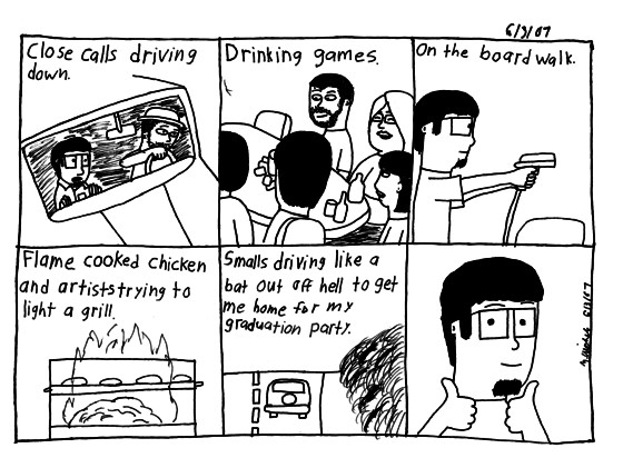 What a great weekend. Thanks to Emily for putting it together. We started the weekend by meeting up with Eric, Andy, Jenny, and Jon at school. We moved Jenny's horses and laying mouse traps in the sculpture studio. Then met up with Emily, Lisa, Jeremy and Patrick at Jenny's apartment. Then we hit the road. There was a really sharp turn and shifting of leaders. Eventually we got down to Ocean City. Unpacked and started hanging about and broke out the beer. Eventually Nuemann and Mary Kate meet us at the cabins. Grilling and drinking continued. Eventually playing Kings and had the funniest rule ever(not allowing to use words with s's). After many hours we called it a night. The next day we headed to the boardwalk. Walked up and down and visited arcades and shops. Growing tired we picked up some chicken at the Acme and returned to our cabins. We then began grilling once more. setting a blaze many a coal and grilling many a blacken chicken. Said goodbye to Nuemann, Eric and Jeremy. Much more drinking and playing a drinking game to the Venture Brothers DVD. Eventually calling it a night and sleeping. The next day we cleaned up our wall of empty bottles and cans lining the ledges of the porch. We were now in search of an IHOP. After looking about we found one and ate quickly because I had to get home. Being the awesome guy Jon is he drove really fast to get me home. Which he did with 9 minutes to spare.