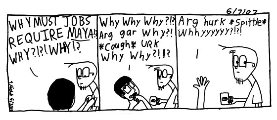 My grudge against this program is simply that I don't know how to use it. I have been educated onĀ Softimage. Though it is popular as well. From description of jobs I have seen the require either Maya or 3d Max(another program I have no idea how to use). So now I have to learn them just enough to say I know how to use them and hopefully get a job.