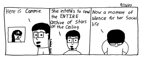 It's true, she told me she plans to read all of my comics. Now since I did this strip she kinda has to haha. I just wanna make clear that I'm not making her, she's doing this all on her own. Which is cool. Granted there are people who've been reading this strip for a long long time, but I doubt anybody has read them all. If there is nobody told me. But I think it's important to point out though that she is a new reader and she's never met me in real life. Which I think is interesting to point out.