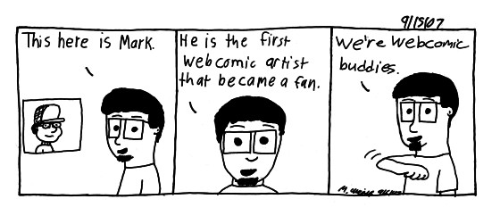You remember Mark, he does Autumn Lake. Yup he also gave me some awesome guest comics. Subsequently I've become friendly with Mustela of World 2, Courtney over at Marksville, Kyle and Noah at Vacant and Engaged(Kyle resembles me haha), and I have even got a kind word from David Buist who does Taking the Bi-Pass.