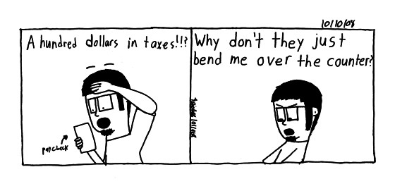 First in our obscure reference category(which I do often haha), the title comes from a Zit comic where the main character(Jeremy) complains about them taking taxes out of his check and his parents said above.