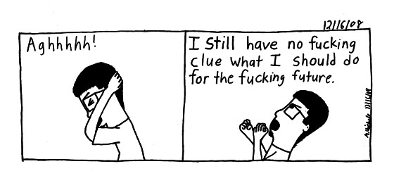 When I think about it all I want out of life is to live on my own, have money to pay bills and do whatever I want. How I'd get there I still have no idea. I think in this I'm getting pissed cause I'm not working towards anything. I'm just working at the store, drawing a comic here or there, and play video games. Other then that I don't work to some goal. Funny thing is I don't know what I wanna work towards. Cause I also worry that at the other side I'll be no closer then I am now. I think up to this point has freaked me out. Going to college and all that and I'm still at home. I guess I believed in that whole go to college and then you'll have a job, which happen to some but not to me.