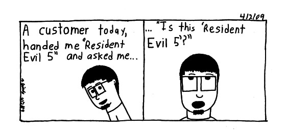 I mean technically she was right to ask. She was bringing up the display case, so it wasn't really resident evil 5. Still though, it's on the fucking box.