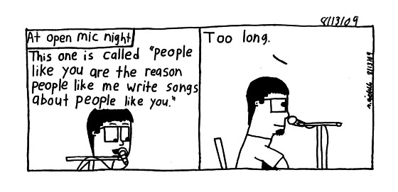 Yup, I returned to open mic night at the dive. Granted it was a little emptier then when I usually go but we still had fun. I even sang a bit. In terms of the title if you remember this song they are the same just a different title. Also I'm not making up the second panel, somebody shouted that back to me.
