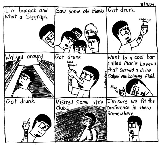 HI!!!! New Orleans was awesome. Good times, good drinks and good friends. My animator buddies Dave, Nick, Eric, and Andy where there. We did go to the convention, there were some interesting things. I talked to a few people about work and have emails to send out. The hotel was the most convenient one we ever stayed at, there was all kinds of things within walking distance, also it was right on Bourbon st. For the eight days I was there, I only got drunk three times, the other days we were recovering. As for the strip clubs, we only went on the nights we were really drunk and the criteria for our visits were no cover and cheap beer.