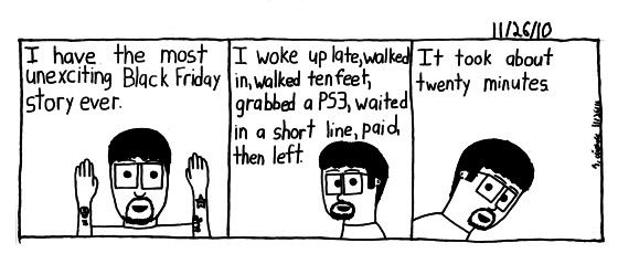 This is the first time in like three years that I went to Black Friday as a customer and it was kinda low key. I wanted a certain PS3 bundle only available at Wal Mart, for those of you who don't know, I hate this particular Wal Mart. So the idea of waking up as early to stand in line just to get in and have them run out was not a particular appealing idea. But I was gonna go around 7, so I set my alarm and went to sleep. I neglected however to make sure it was am not pm. So I woke up late and ended up getting to WalMart at 8. They opened at midnight so I was hoping that the craziness would be over by then. Surprisingly I was right and the rest is documented.