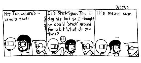 I don't know what this says about me by adding another fictional version of myself, but I just liked the look and the potential for hilarity, so I had too. For now Stickfigure Tim is here till the end of the story arc. As it get's towards the end of the arc I'll decide whether to keep him or not.
