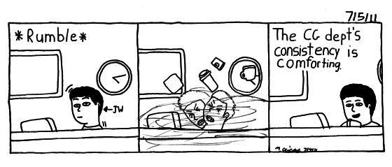 Most days around 3 or 4 the cg crew goes up to the floor above(same company as the place I work at) to go for coffee(they have a starbucks machine). Every once in awhile people joke that we're right on time.