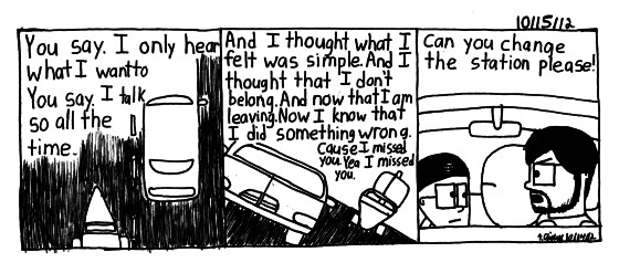 "And so I, I turned the radio on, I turned the radio up And this woman was singin' my song. The lover's in love and the other's run away. The lover is cryin' 'cause the other won't stay. Some of us hover when we weep for the other who was. Dying since the day they were born. Well, this is not that. I think that I'm throwing, but I'm thrown."