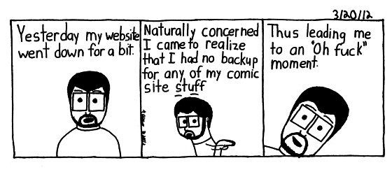 While on my computer I accidentally hit my website tab and after a few minutes, nothing. Same for my portfolio site. My website was not working. I couldn't connect with my various programs. I grew concerned also kinda unhappy cause as the comic said, I have no backup. Granted I have all the comics and original artwork. But no backups of the actual website. Trying to bear in mind that the website has go off for short bits of time I swore to backup everything when it comes back, which I did. So all's well that ends well. Just the thought of all my and nephews hard work going poof was concerning.