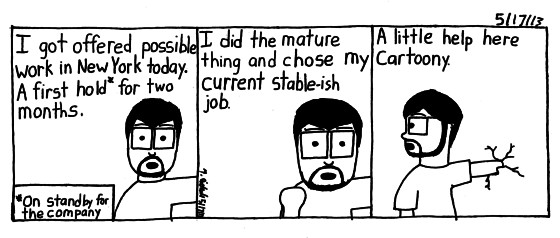 The first time I quit my job and went to New York, I was a part time cashier/stocker. Now I'm a full time employee with Health benefits. Granted I'll probably make more working there, but it'll cost me more to commute there and live in New York(Crashing at friends places only saves so much money). Don't get me wrong, I loved the the time I spent in New York, met awesome folks, made work I was proud of, and had fun(some argue to much =0p). Maybe when the right opportunity arises I'll go back. For now, looks like I'm staying in town.