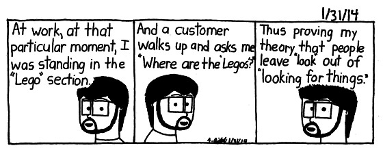 I've been asked stupid questions in the past, but this is the first time I was so shocked by the stupid question I couldn't even answer them. If you ever seen the lego section of the toy store, It's not just one aisle, but several and it's not subtle and quite obviously the lego section. I honestly stood there in silence till the customer figured out they were standing in the aisle.