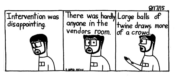 First off, I hate to say anything bad about good cons. Cause Intervention was a good con, it was well organized and everybody seemed to be having fun. Unfortunately there were hardly any people walking around buying things. Which is kinda the point of me going. This could be an isolated case, I haven't been to more then one to judge. But this is not a good first impression. We shall see if I'll be there next year. Though I encourage you all to check it out.