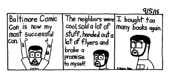 Baltimore Comic Con was great. I was at the very front. I was skeptical at first that it would be a good spot but it turns out I was wrong. Besides a fire alarm going off, making us evacuate, and some confusion loading into the con, it went off without a hitch. My awesome neighbors Paste Pot Prefects were great fun. I also visited with old con buddies and got lots of new books too read. Good times and looking forward to next year!