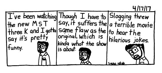 I've been enjoying the new MST3K. It's clever, has a funny cast, and of course it has Felicia Day. Though I feel sometimes they miss opportunities for jokes and that they actually refer to it as MST3K in the show. They never did that in the original series. And to expand on the comic. Certain episodes of MST3K are hard to watch, not because of the MST3K parts, but the movie itself. It's just so terrible you don't want to watch anymore, but you do because the rest is pretty awesome. I remember watching Pod People and just praying for the movie to be over. But alas it was not.