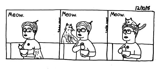 Everytime we eat the cat does the first two panels. He has yet to scale Abigail like a mountain.