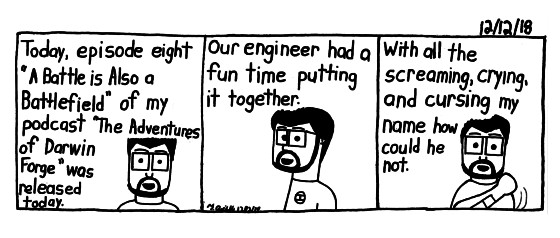 I assure you my engineer is alive and well *cough cough*. Not gonna lie, did this comic as a friendly reminder that I do have a old time radio show podcast, The Adventures of Darwin Forge, Monster Hunter. You should go to the website, or your favorite podcast app and check it out. We have 4 more episodes in the season!