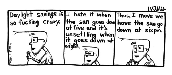 "Daylight fading. Come and waste another year. All the anger and the eloquence are bleeding into fear. Moonlight creeping around the corners of our lawn. When we see the early signs that daylight's fading. We leave just before it's gone." (Daylight Fading, Counting Crows)