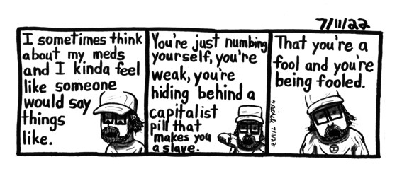 I imagine the stigma of medication for mental health will be around for a long time. I purposely left off any sort of conclusion to this comic. I don't actually know if there is some sort of anti-capitalist movement against medication but for some reason it feels like a very real thing, mixed in with the implication that you are not strong enough to make it on your own. And most importantly, it is up to individuals to decide if medicine is right for you. I just know that it's something that I do and believe it is for the best.