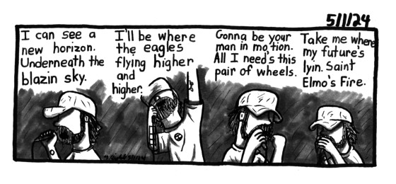 "Burning up, don't know just how far that I can go. Just how far I go. Soon be home, only just a few miles down the road. I can make it, I know, I can. You broke the boy in me but you won't break the man." (St. Elmo’s Fire(Man in Motion), John Parr) |